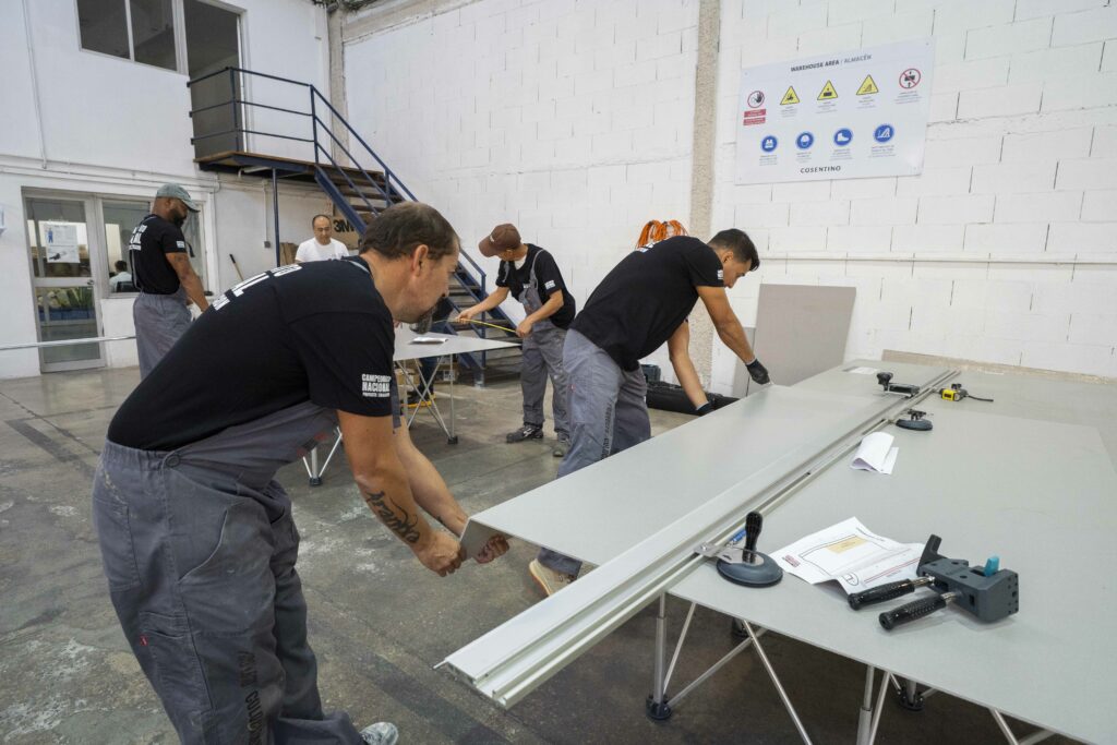 El evento se celebró en las instalaciones de Cosentino Center, un espacio idóneo que acogió una intensa jornada de competición en la que los participantes demostraron su destreza en pruebas prácticas diseñadas para evaluar el nivel real de ejecución en trabajos de colocación. Desde el inicio, se respiró un ambiente de compañerismo, respeto y sana competitividad, donde la técnica y la pasión por el oficio estuvieron presentes en cada detalle.