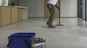 En revestimientos verticales de porcelánico esmaltado se empleó PHZERO, un detergente ácido que elimina residuos de obra difíciles y salitre.