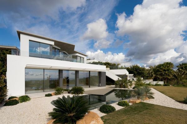 Las piscinas, revestidas con piedra india, introducen un contraste cromático sutil respecto al marfil, manteniendo la coherencia del diseño y ofreciendo un oasis visual que potencia el carácter mediterráneo de la villa.